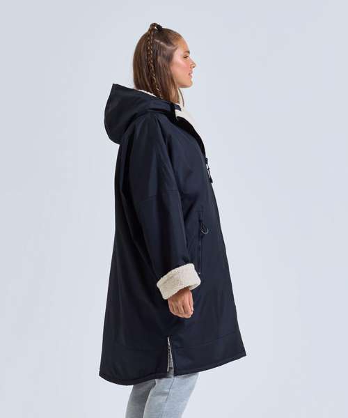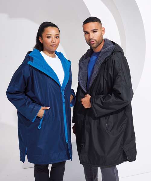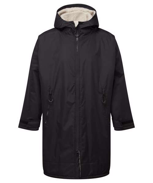 Unisex. Oversized. Full-length two-way plastic zip with easy pull toggles. Chin guard. Oversized fit. Side vents. Adjustable cuffs with hook and loop fastening. Side zip pockets. Inside pocket with zip on the left side. Inside patch pocket on the right side. 3-panelled hood. Loop on the centre back of the jacket for hanging the robe. Dropped back hemline. (5000/5000 waterproof and windproof). Embroidery access to the back and chest area can be accessed through here. Waterproof taped seamed outer layer. Sherpa fleece interior. Rebrandable stuff sack carry bag with double drawstring straps. CE Class 1 Certified.