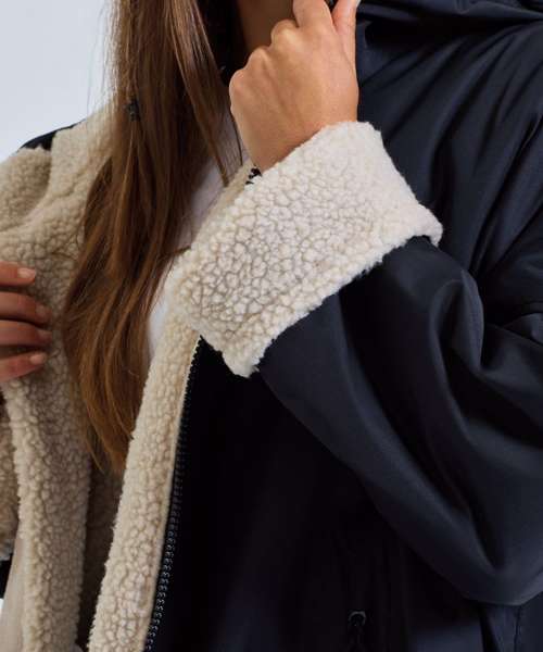 Outer: 50% Recycled Polyester, 50% Polyester. Woven Fabric & PVC Coating. (5000/5000 waterproof and windproof). Inner sherpa and polar fleece lining: 55% Recycled Polyester, 45% Polyester. Taped Seams: CE Class 1 Certified With Packable Bag. Black/Charcoal, Navy/Sapphire, Olive/Natural: 100% Polyester.